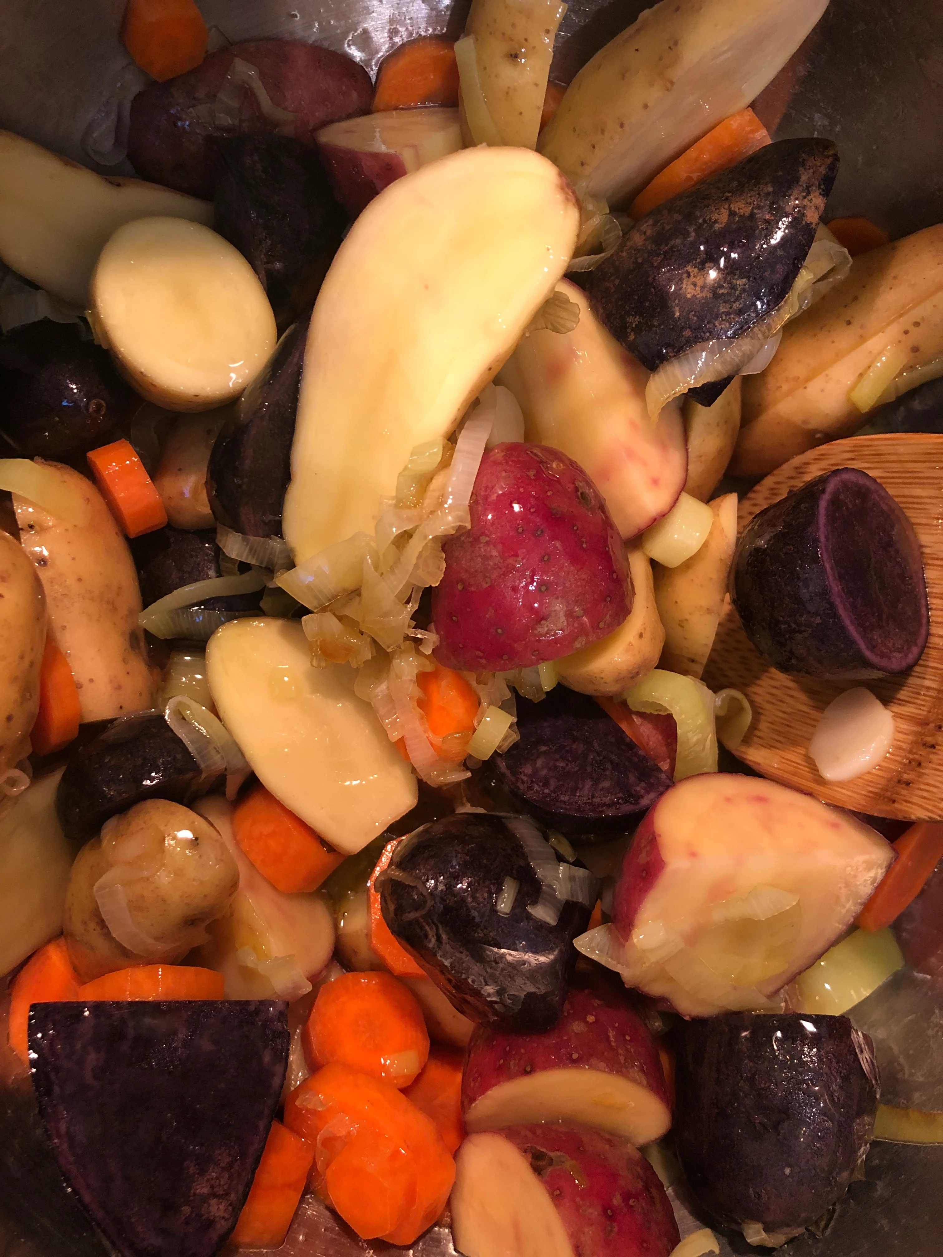 Potatoes. I use fingerling potatoes in all appropriate soups like this one because a) they are colorful and cute b) when eaten with skin on they will bring so much needed fiber, and they are considered the healthiest potato type too. Try to use them in soups and let me know how you like them.